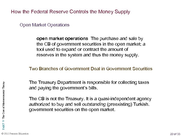 How the Federal Reserve Controls the Money Supply Open Market Operations open market operations The purchase and sale by the CB of government securities in the open market; a tool used to expand or contract the amount of reserves in the system and thus the money supply. PART V The Core of Macroeconomic Theory Two Branches of Government Deal in Government Securities © 2012 Pearson Education The Treasury Department is responsible for collecting taxes and paying the government’s bills. The CB is not the Treasury. It is a quasi-independent agency authorized to buy and sell outstanding (preexisting) Turkish. government securities on the open market. 22 of 33