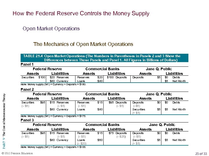 How the Federal Reserve Controls the Money Supply Open Market Operations The Mechanics of Open Market Operations TABLE 25. 4 Open Market Operations (The Numbers in Parentheses in Panels 2 and 3 Show the Differences between Those Panels and Panel 1. All Figures in Billions of Dollars) Panel 1 Federal Reserve Assets Liabilities Securities $100 $20 Reserves $80 Currency Commercial Banks Assets Liabilities Reserves Loans $20 $80 $100 Deposits Jane Q. Public Assets Liabilities Deposits $5 $0 $5 Debts Net Worth PART V The Core of Macroeconomic Theory Note: Money supply (M 1) = Currency + Deposits = $180. Panel 2 Federal Reserve Assets Liabilities Securities ( $5) $95 $15 Reserves ( $5) $80 Currency Commercial Banks Assets Liabilities Reserves ( $5) Loans $15 $95 Deposits ( $5) $80 Jane Q. Public Assets Liabilities Deposits ( $5) Securities (+ $5) $0 $0 Debts $5 $5 Net Worth Note: Money supply (M 1) = Currency + Deposits = $175. Panel 3 Federal Reserve Assets Liabilities Securities ( $5) $95 $15 Reserves ( $5) $80 Currency Commercial Banks Assets Liabilities Reserves ( $5) Loans ( $20) $15 $60 $75 Deposits ( $25) Jane Q. Public Assets Liabilities Deposits ( $5) Securities (+ $5) $0 $0 Debts $5 $5 Net Worth Note: Money supply (M 1) = Currency + Deposits = $155. © 2012 Pearson Education 23 of 33