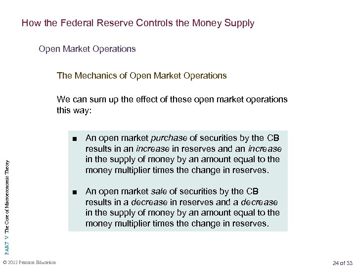 How the Federal Reserve Controls the Money Supply Open Market Operations The Mechanics of Open Market Operations PART V The Core of Macroeconomic Theory We can sum up the effect of these open market operations this way: © 2012 Pearson Education ■ An open market purchase of securities by the CB results in an increase in reserves and an increase in the supply of money by an amount equal to the money multiplier times the change in reserves. ■ An open market sale of securities by the CB results in a decrease in reserves and a decrease in the supply of money by an amount equal to the money multiplier times the change in reserves. 24 of 33