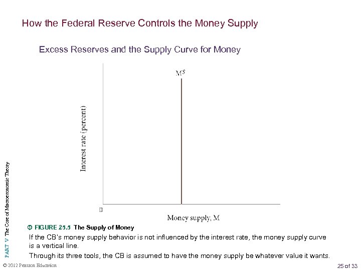 How the Federal Reserve Controls the Money Supply PART V The Core of Macroeconomic Theory Excess Reserves and the Supply Curve for Money FIGURE 25. 5 The Supply of Money If the CB’s money supply behavior is not influenced by the interest rate, the money supply curve is a vertical line. Through its three tools, the CB is assumed to have the money supply be whatever value it wants. © 2012 Pearson Education 25 of 33