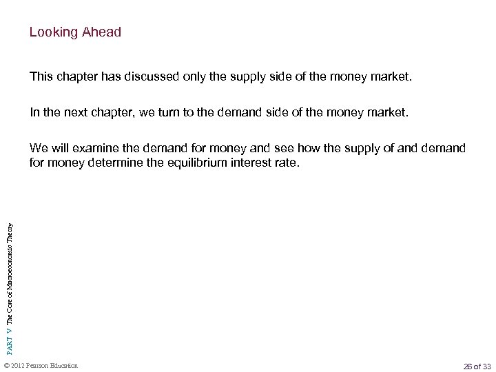 Looking Ahead This chapter has discussed only the supply side of the money market. In the next chapter, we turn to the demand side of the money market. PART V The Core of Macroeconomic Theory We will examine the demand for money and see how the supply of and demand for money determine the equilibrium interest rate. © 2012 Pearson Education 26 of 33