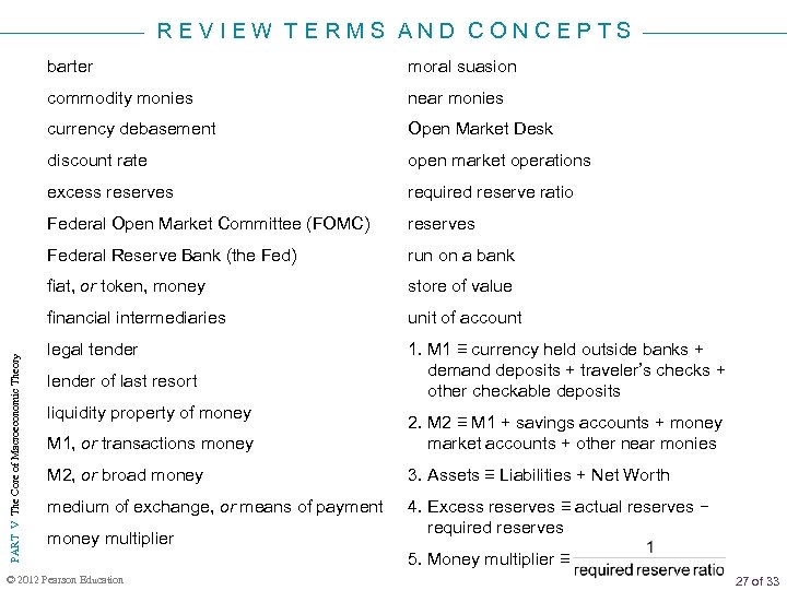REVIEW TERMS AND CONCEPTS moral suasion commodity monies near monies currency debasement Open Market Desk discount rate open market operations excess reserves required reserve ratio Federal Open Market Committee (FOMC) reserves Federal Reserve Bank (the Fed) run on a bank fiat, or token, money store of value financial intermediaries PART V The Core of Macroeconomic Theory barter unit of account legal tender 1. M 1 ≡ currency held outside banks + demand deposits + traveler’s checks + other checkable deposits lender of last resort liquidity property of money M 1, or transactions money 2. M 2 ≡ M 1 + savings accounts + money market accounts + other near monies M 2, or broad money 3. Assets ≡ Liabilities + Net Worth medium of exchange, or means of payment 4. Excess reserves ≡ actual reserves − required reserves money multiplier © 2012 Pearson Education 5. Money multiplier ≡ 27 of 33