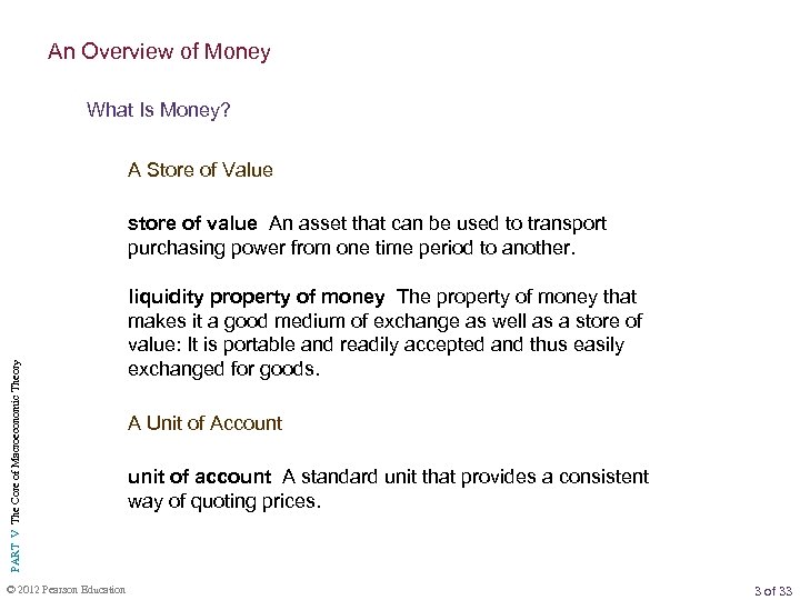 An Overview of Money What Is Money? A Store of Value PART V The Core of Macroeconomic Theory store of value An asset that can be used to transport purchasing power from one time period to another. © 2012 Pearson Education liquidity property of money The property of money that makes it a good medium of exchange as well as a store of value: It is portable and readily accepted and thus easily exchanged for goods. A Unit of Account unit of account A standard unit that provides a consistent way of quoting prices. 3 of 33