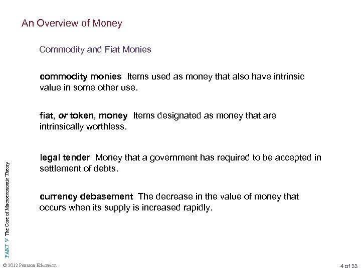 An Overview of Money Commodity and Fiat Monies commodity monies Items used as money that also have intrinsic value in some other use. PART V The Core of Macroeconomic Theory fiat, or token, money Items designated as money that are intrinsically worthless. legal tender Money that a government has required to be accepted in settlement of debts. currency debasement The decrease in the value of money that occurs when its supply is increased rapidly. © 2012 Pearson Education 4 of 33