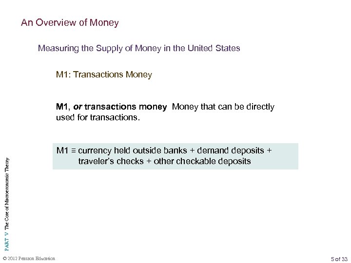 An Overview of Money Measuring the Supply of Money in the United States M 1: Transactions Money PART V The Core of Macroeconomic Theory M 1, or transactions money Money that can be directly used for transactions. © 2012 Pearson Education M 1 ≡ currency held outside banks + demand deposits + traveler’s checks + other checkable deposits 5 of 33