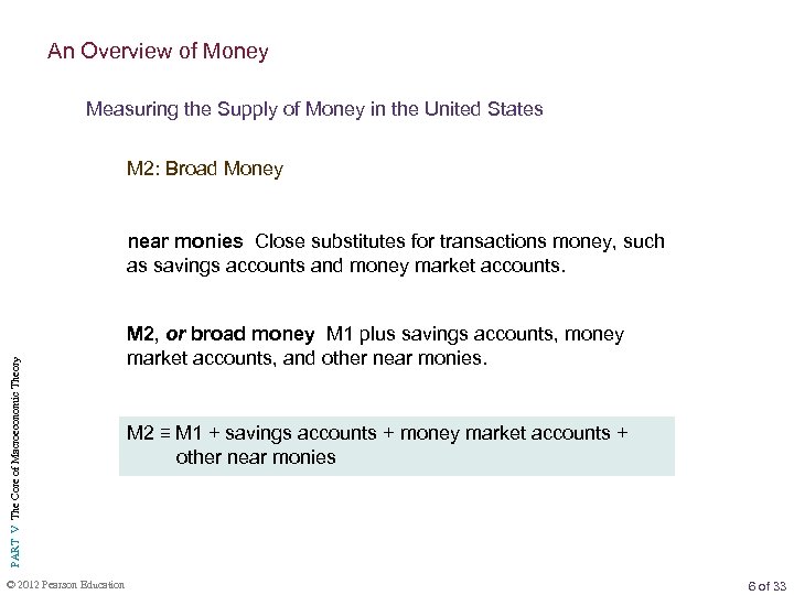 An Overview of Money Measuring the Supply of Money in the United States M 2: Broad Money PART V The Core of Macroeconomic Theory near monies Close substitutes for transactions money, such as savings accounts and money market accounts. © 2012 Pearson Education M 2, or broad money M 1 plus savings accounts, money market accounts, and other near monies. M 2 ≡ M 1 + savings accounts + money market accounts + other near monies 6 of 33
