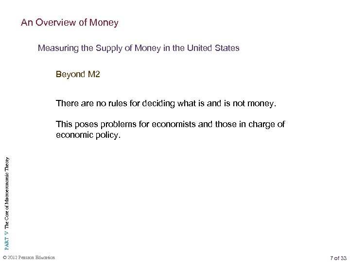 An Overview of Money Measuring the Supply of Money in the United States Beyond M 2 There are no rules for deciding what is and is not money. PART V The Core of Macroeconomic Theory This poses problems for economists and those in charge of economic policy. © 2012 Pearson Education 7 of 33