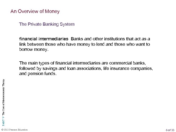 An Overview of Money The Private Banking System financial intermediaries Banks and other institutions that act as a link between those who have money to lend and those who want to borrow money. PART V The Core of Macroeconomic Theory The main types of financial intermediaries are commercial banks, followed by savings and loan associations, life insurance companies, and pension funds. © 2012 Pearson Education 8 of 33