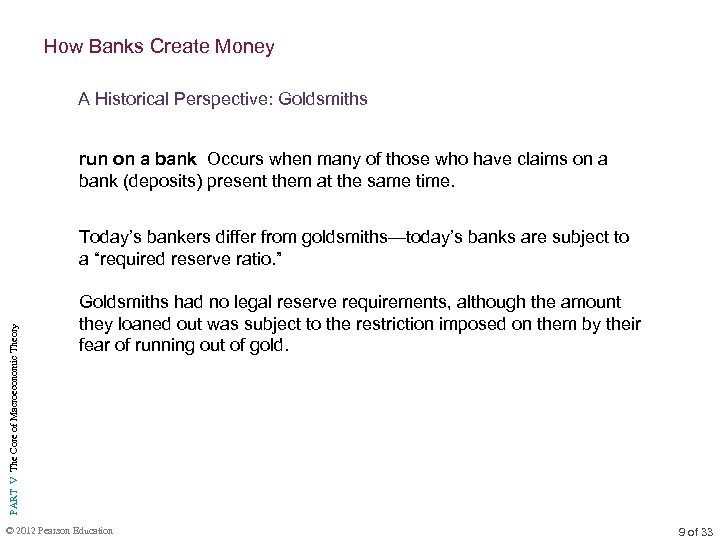 How Banks Create Money A Historical Perspective: Goldsmiths run on a bank Occurs when many of those who have claims on a bank (deposits) present them at the same time. PART V The Core of Macroeconomic Theory Today’s bankers differ from goldsmiths—today’s banks are subject to a “required reserve ratio. ” Goldsmiths had no legal reserve requirements, although the amount they loaned out was subject to the restriction imposed on them by their fear of running out of gold. © 2012 Pearson Education 9 of 33