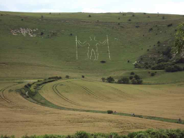 Historical information Originally the sculpture was carved into the chalk hillside. In 1874, Sussex Archaeological Society marked the contours of the giant with yellow brick, and in 1891 the yellow bricks were replaced with white. During the Second World War the bricks were painted with green paint to camouflage them, and after the war they were newly whitewashed. Finally, in 1969, mysterious image has been updated with 770 concrete blocks. All of these changes might destructed the figure’s original appearance. Most likely, that this mysterious figure of the giant had a religious sence, being the idol or a symbol of fertility. The most popular legends are that the mysterious figure is a grave or giant’s tombstone, or is it the contours of the place where he fell and died. At nowadays this is the popular place for pagan rites. «Wilmington Giant» is still be the property of Sussex Archaeological Society.