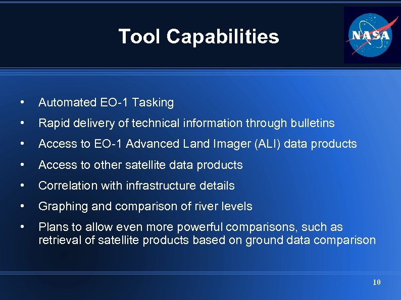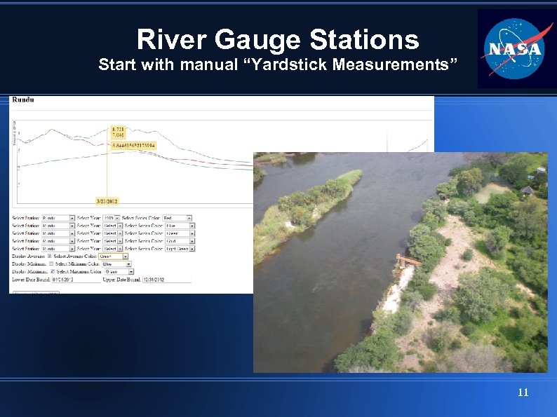 Tool Capabilities • Automated EO-1 Tasking • Rapid delivery of technical information through bulletins • Access to EO-1 Advanced Land Imager (ALI) data products • Access to other satellite data products • Correlation with infrastructure details • Graphing and comparison of river levels • Plans to allow even more powerful comparisons, such as retrieval of satellite products based on ground data comparison 10