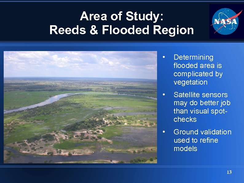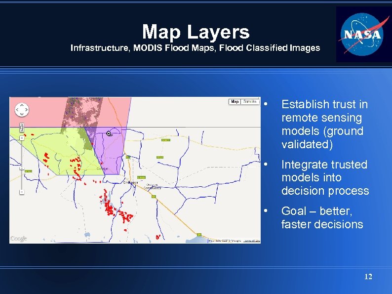 Map Layers Infrastructure, MODIS Flood Maps, Flood Classified Images • Establish trust in remote sensing models (ground validated) • Integrate trusted models into decision process • Goal – better, faster decisions 12