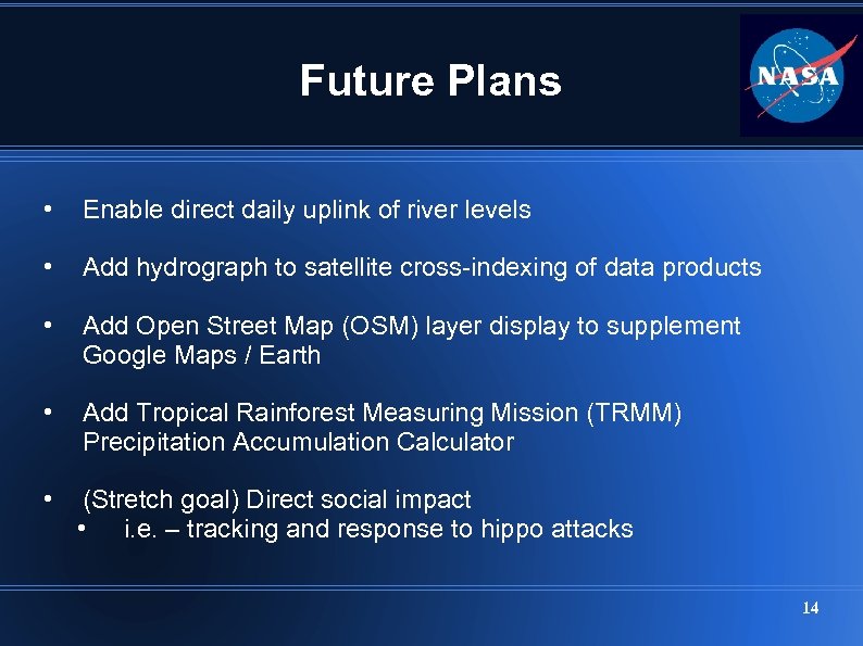 Future Plans • Enable direct daily uplink of river levels • Add hydrograph to satellite cross-indexing of data products • Add Open Street Map (OSM) layer display to supplement Google Maps / Earth • Add Tropical Rainforest Measuring Mission (TRMM) Precipitation Accumulation Calculator • (Stretch goal) Direct social impact • i. e. – tracking and response to hippo attacks 14