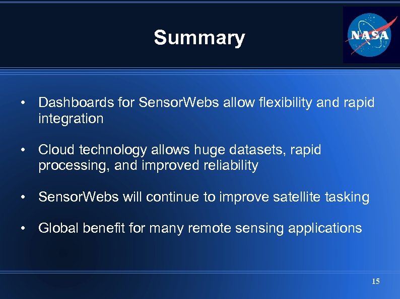Summary • Dashboards for Sensor. Webs allow flexibility and rapid integration • Cloud technology allows huge datasets, rapid processing, and improved reliability • Sensor. Webs will continue to improve satellite tasking • Global benefit for many remote sensing applications 15