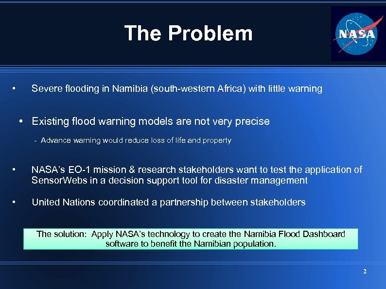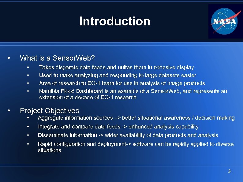 The Problem • Severe flooding in Namibia (south-western Africa) with little warning • Existing flood warning models are not very precise - Advance warning would reduce loss of life and property • NASA’s EO-1 mission & research stakeholders want to test the application of Sensor. Webs in a decision support tool for disaster management • United Nations coordinated a partnership between stakeholders The solution: Apply NASA’s technology to create the Namibia Flood Dashboard software to benefit the Namibian population. 2