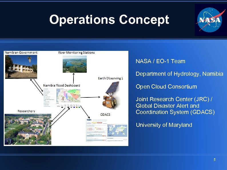 Operations Concept NASA / EO-1 Team Department of Hydrology, Namibia Open Cloud Consortium Joint Research Center (JRC) / Global Disaster Alert and Coordination System (GDACS) University of Maryland 5