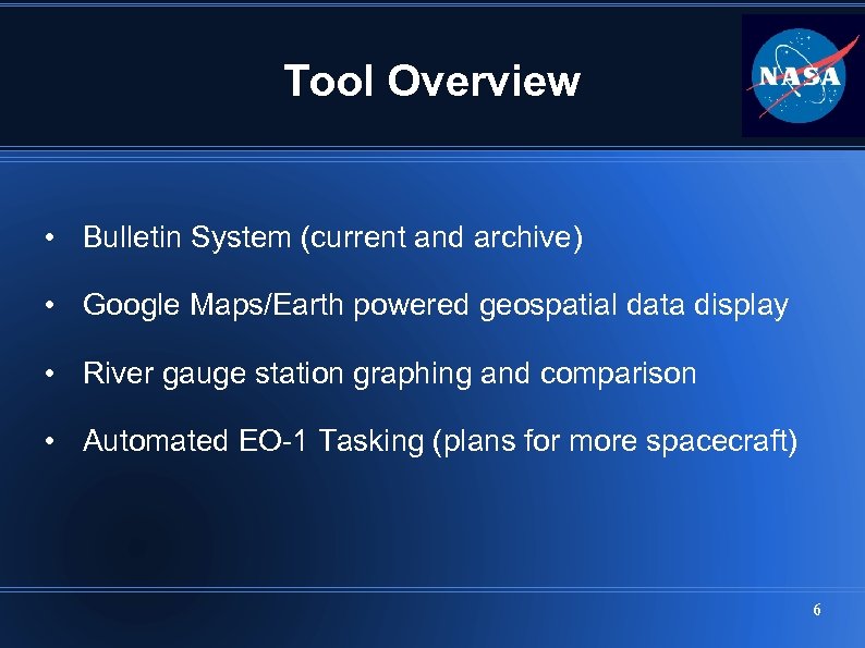 Tool Overview • Bulletin System (current and archive) • Google Maps/Earth powered geospatial data display • River gauge station graphing and comparison • Automated EO-1 Tasking (plans for more spacecraft) 6