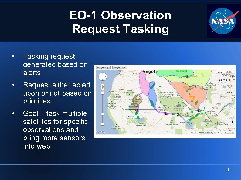Introduction • What is a Sensor. Web? • • • Takes disparate data feeds and unites them in cohesive display Used to make analyzing and responding to large datasets easier Area of research to EO-1 team for use in analysis of image products Namibia Flood Dashboard is an example of a Sensor. Web, and represents an extension of a decade of EO-1 research Project Objectives • Aggregate information sources –> better situational awareness / decision making • Integrate and compare data feeds -> enhanced analysis capability • Disseminate information -> wider availability of data products and analysis • Rapid configuration and deployment-> software can be rapidly applied to diverse situations 3