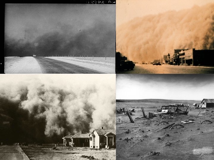 • affects KS, OK, TX, NM & CO • farmers unable to pay back debt to banks [400 k farms foreclosed upon (1929 -1932)] • families forced to migrate west, migrants known as “Okies”, discriminated in jobs/housing [Grapes of Wrath]