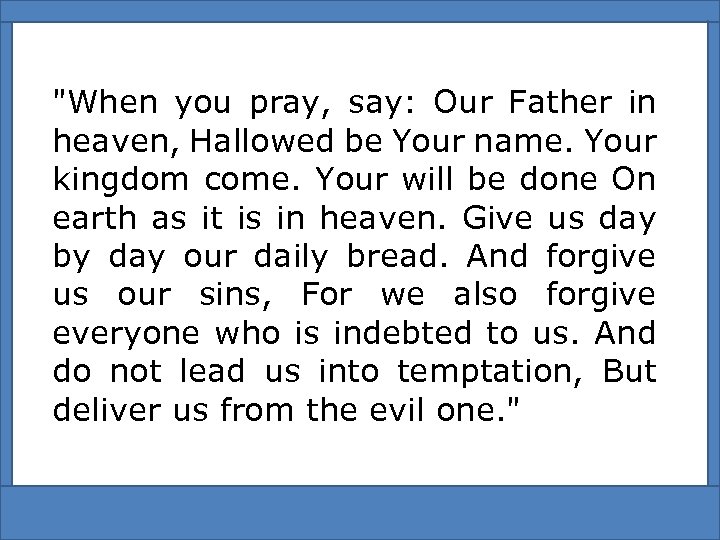 "When you pray, say: Our Father in heaven, Hallowed be Your name. Your kingdom come. Your will be done On earth as it is in heaven. Give us day by day our daily bread. And forgive us our sins, For we also forgive everyone who is indebted to us. And do not lead us into temptation, But deliver us from the evil one. "