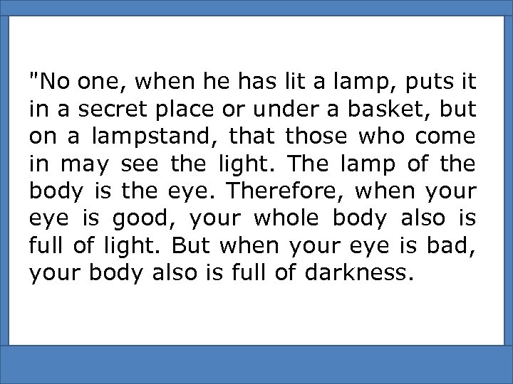 "No one, when he has lit a lamp, puts it in a secret place or under a basket, but on a lampstand, that those who come in may see the light. The lamp of the body is the eye. Therefore, when your eye is good, your whole body also is full of light. But when your eye is bad, your body also is full of darkness.