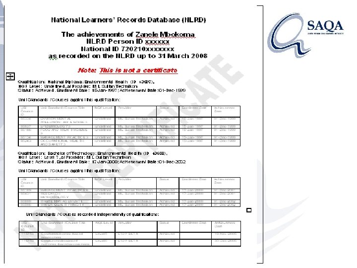 Individual Verifications Information required: • Full names (including previous surname/s) • National ID number • Date of Birth Results: A learner transcript (see next slide) NB: Verifications for individuals are done free of charge