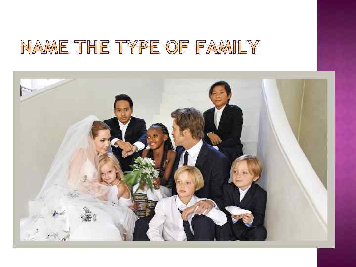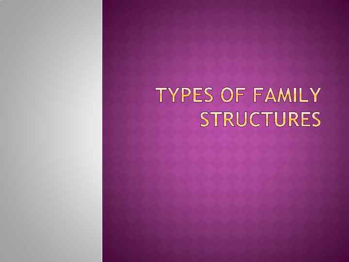 The nuclear family is the traditional type of family structure. This family type consists of two parents and children. The nuclear family was long held in esteem by society as being the ideal in which to raise children. Children in nuclear families receive strength and stability from the two-parent structure and generally have more opportunities due to the financial ease of two adults.