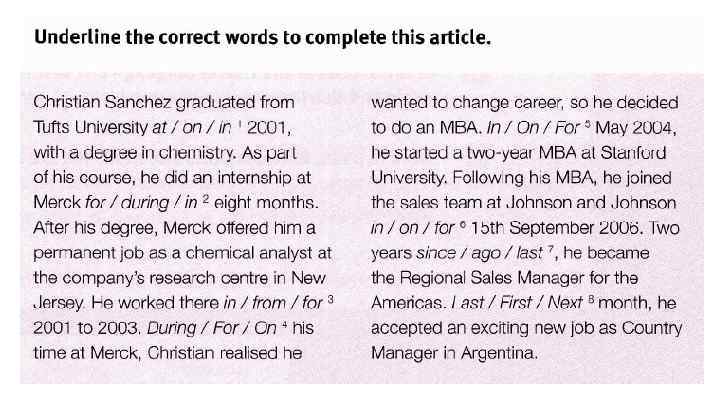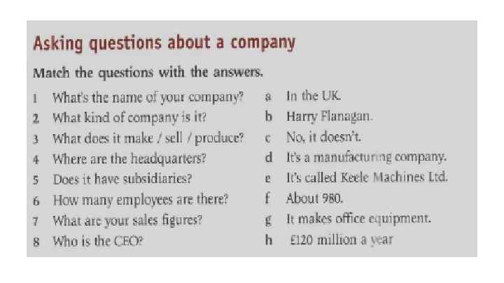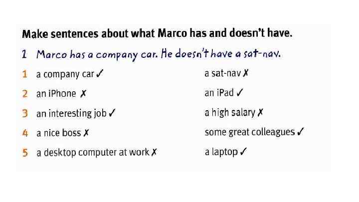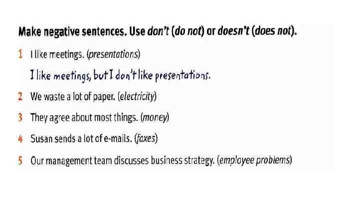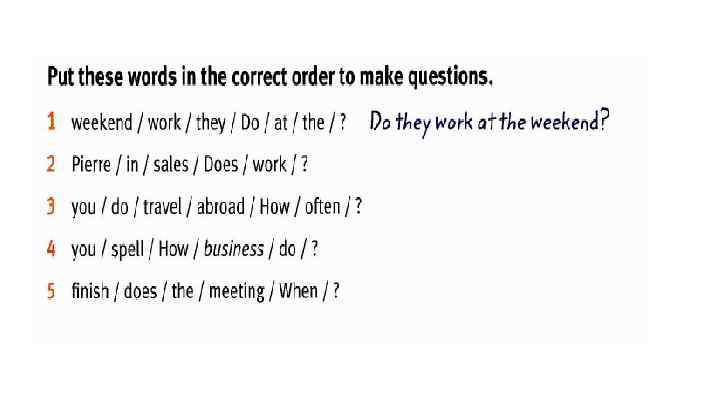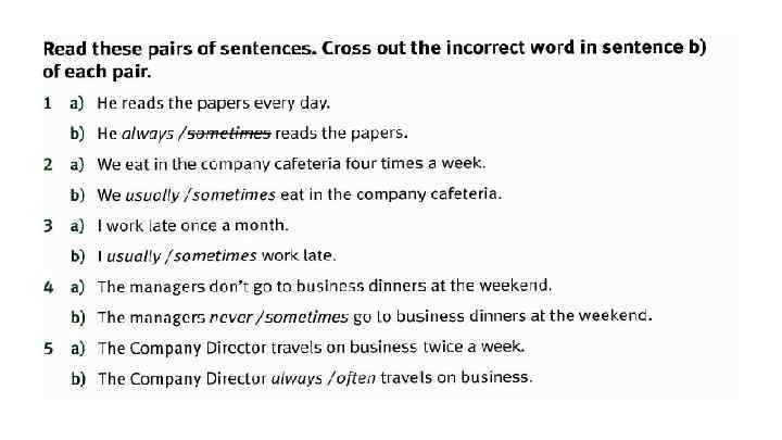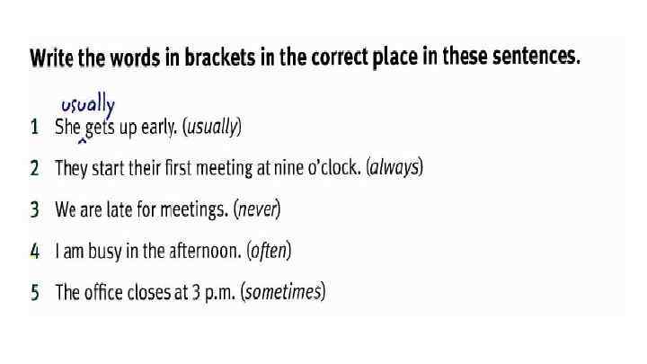 Rewrite the sentences with the words in brackets in the correct place. 1. Tina has lunch in the company cafeteria. (vever) Tina never has lunch in the company cafeteria. 2. Jameel goes to conferences abroad. (sometimes) 3. Rick isn’t very busy on Mondays. (usually ) We are at home in the evening. (never) Do you go to work by train? (always) 6. James does not travel on business. (often) 7. I stay at home at the weekend. (usually) 8. Why are some people late for work? (always)