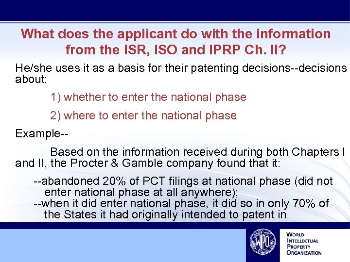 What does the applicant do with the information from the ISR, ISO and IPRP Ch. II? He/she uses it as a basis for their patenting decisions--decisions about: 1) whether to enter the national phase 2) where to enter the national phase Example-Based on the information received during both Chapters I and II, the Procter & Gamble company found that it: --abandoned 20% of PCT filings at national phase (did not enter national phase at all anywhere); --when it did enter national phase, it did so in only 70% of the States it had originally intended to patent in