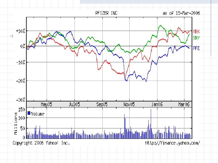 Company Statistics Market capitalization: US$191. 31 billion Average Volume (3 months): 33, 466, 600 Employees (worldwide): 106, 000 Annual R&D expenses as a % of revenues: 14. 5% in 2005 Largest markets: North America, Europe and Japan Stock symbol: PFE (NYSE) Stock price: US$25. 95 ( closing price as of March 15, 2006) 52 week Range: 20. 27 -29. 21 Number of outstanding common shares: 7. 53 billion Dividend Yield: 0. 81 (3. 12%) P/E: 23. 59