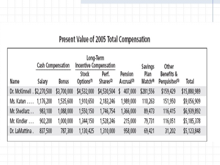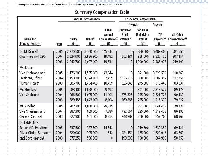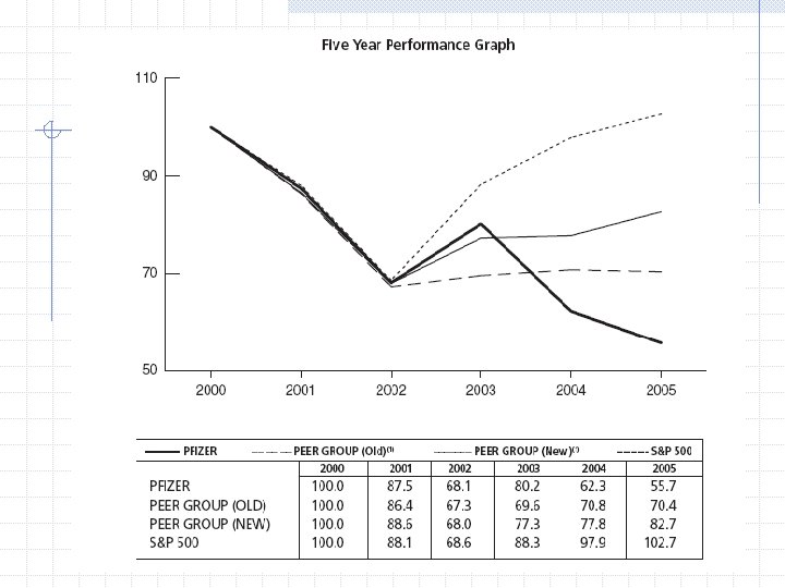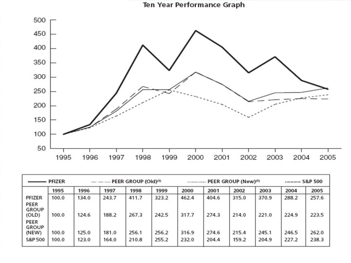 For 2005, Pfizer’s pharmaceutical peer group consisted of the following companies: Abbott Laboratories, Amgen, Astra. Zeneca, Bristol-Myers , Squibb Company, Eli Lilly and Company, Glaxo. Smith. Kline, Johnson & Johnson, Merck and Co. , Schering. Plough Corporation and Wyeth (New Peer Group). Prior to that, Pfizer’s pharmaceutical peer group : Abbott Laboratories, Baxter International, Bristol-Myers Squibb Company, Colgate-Palmolive Company, Eli Lilly and Company, Johnson & Johnson, Merck and Co. , Schering-Plough Corporation, and Wyeth (Old Peer Group).