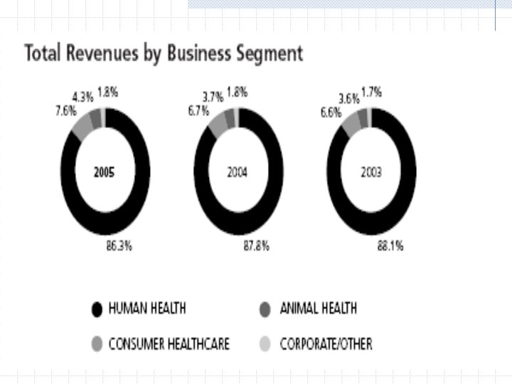 Performance 2005 cont’nd Total Revenue decreased by 2% to $51. 3 billion from 2004 Revenue reduction due to loss of exclusivity by 44% These four products presented 7% as compared to 13% of total revenue in 2004 63% decline in revenue from suspension of Bextra sales and uncertainty about Celebrex But portfolio of patent-protected products includes 4 of 25 best-selling pharmaceutical products with six market leaders in their therapeutical area