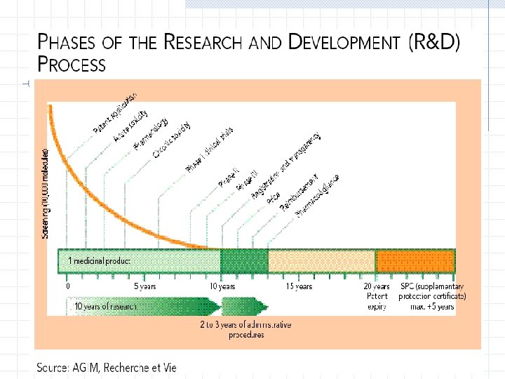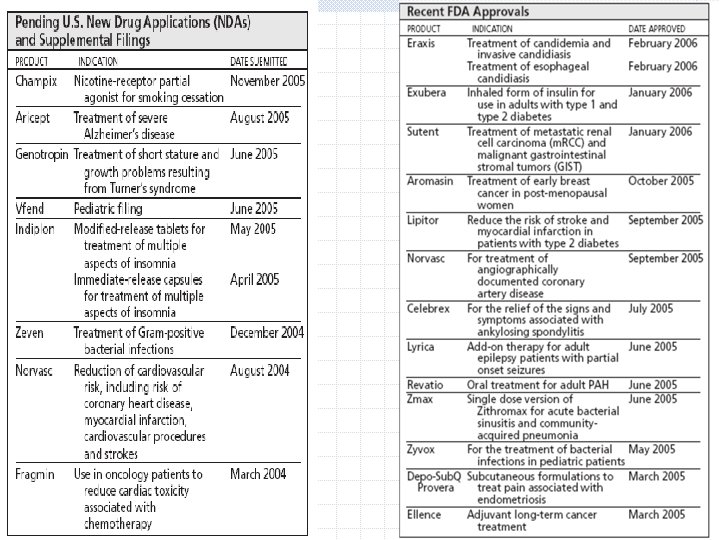 Drug Approval Process Average of 10 - 15 years and $800 million - $1 billion to nurture a drug from initial discovery to market Process: n Academic and Laboratory Research n Testing done on animals n Phase 1: Drug given to a small number of healthy people to test its safety n Phase 2: Drug administered to 100 or more people with the disease that it was intended to treat n Phase 3: Rigorous testing done on larger groups of ill patients n FDA Review – Approval/Disapproval Source: www. fda. gov (and prev. presentation)
