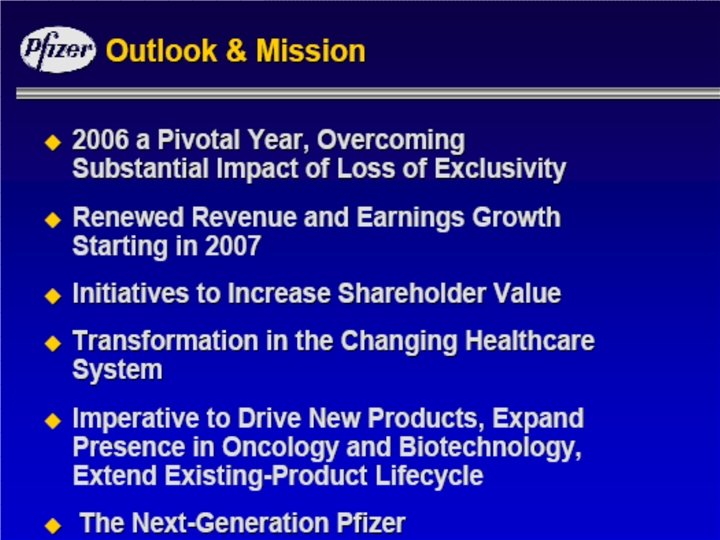 Strategy to Build Shareholder Value "This is a time of transformation for Pfizer and our industry, " said Hank Mc. Kinnell, Pfizer chairman and chief executive officer. Productivity Enhancements n The Adapting to Scale initiative will continue to produce substantial cost savings while creating a more efficient company. Initiatives to Enhance Shareholder Value n Focused on three important initiatives to leverage cash flow: w increasing our dividend payout and yield w purchasing shares w changing Pfizer's business portfolio, including the recently announced decision to explore strategic alternatives for Pfizer Consumer Healthcare (PCH).