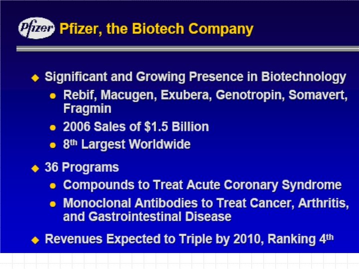 Broad-Based Strategy for Success in Evolving Global Marketplace R&D productivity gains driving pipeline expansion with 235 total projects and planned adjusted R&D expense* of $7. 8 billion in 2006 Pfizer establishing leadership in new areas of biologics and oncology; 2006 biologics revenues of $1. 5 billion expected; oncology pipeline has 22 mid- and early-stage candidates Pfizer demonstrating value of its medicines to payers through compelling pharmacoeconomic data; excellent formulary access achieved in U. S. Medicare market While reducing worldwide plant network from 93 to 66, Pfizer manufacturing investing in new technology and capacity for next generation of medicines