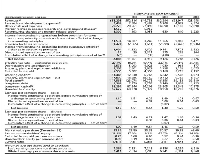 Analysis from financial statements Dividend Rate = 0. 78 Dividend Yield = 1. 7 % Payout Ratio = 29% Dividend: 2003: € 1. 02 2004: € 1. 2 2005: € 1. 52 Net sales: + 9. 3 % EPS : + 25. 7% (18. 2% in 2004) Adjusted EPS: +25. 7% at € 4. 74 ( average number of shares: 1, 336. 5 m)
