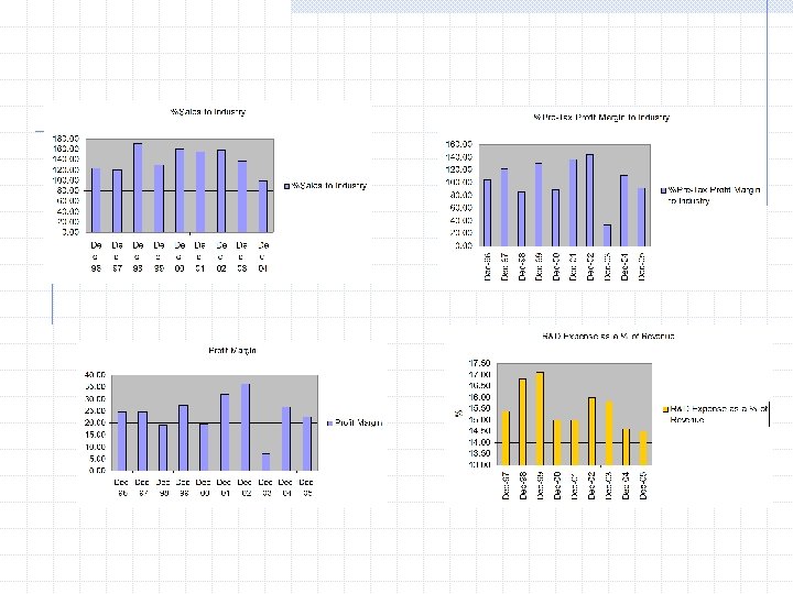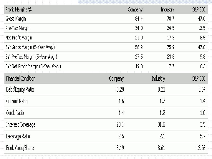 Industry Ratios Major Drug Manufacturers and the Healthcare Sector: P/E ROE% DIV. YIELD 18. 82 13. 24 1. 57 LT DEBT TO EQUITY PRICE TO BOOK VALUE NET PROFIT MARGIN PRICE TO FREE CASH FLOW 0. 01 12. 16 8. 94 -49. 27