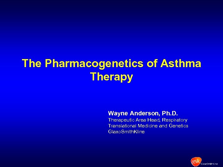 The Pharmacogenetics of Asthma Therapy Wayne Anderson, Ph. D. Therapeutic Area Head, Respiratory Translational Medicine and Genetics Glaxo. Smith. Kline