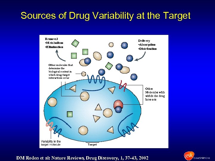 Sources of Drug Variability at the Target Removal • Metabolism • Elimination Delivery • Absorption • Distribution Other molecules that determine the biological context in which drug-target interactions occur Other Molecules with which the drug interacts DM Roden et al: Nature Reviews, Drug Discovery, 1, 37 -43, 2002