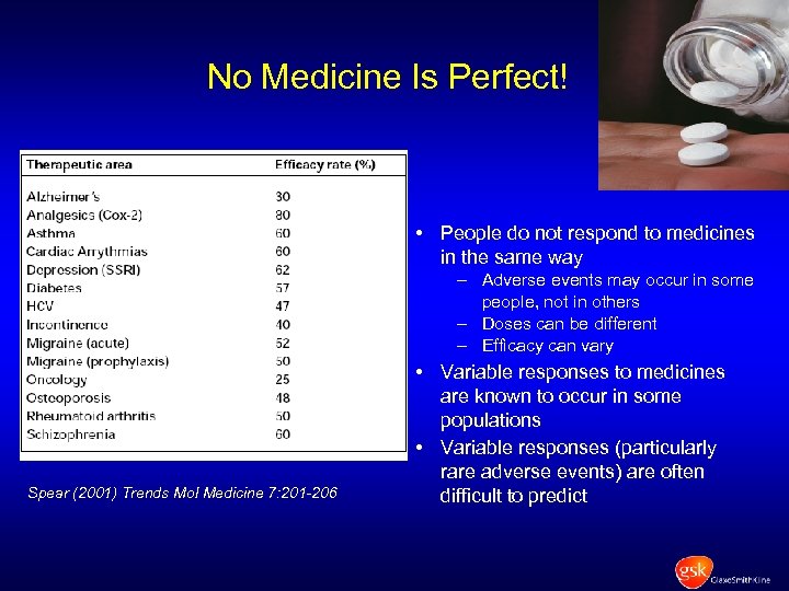 No Medicine Is Perfect! • People do not respond to medicines in the same way – Adverse events may occur in some people, not in others – Doses can be different – Efficacy can vary Spear (2001) Trends Mol Medicine 7: 201 -206 • Variable responses to medicines are known to occur in some populations • Variable responses (particularly rare adverse events) are often difficult to predict