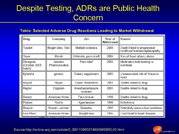 Despite Testing, ADRs are Public Health Concern Table: Selected Adverse Drug Reactions Leading to Market Withdrawal Source: http: //online. wsj. com/article/0, , SB 110960218490965860, 00. html