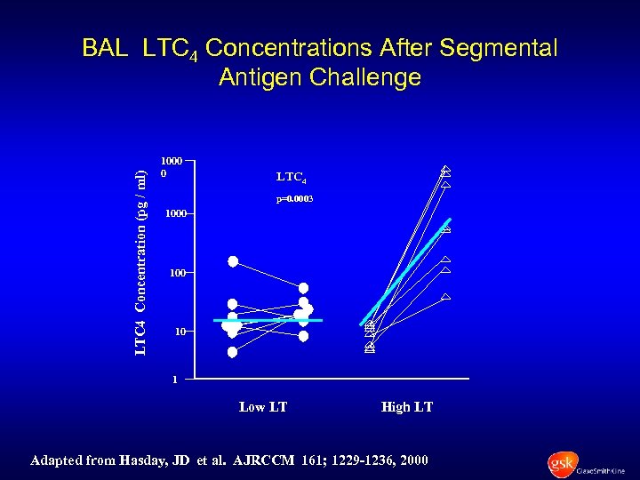 LTC 4 Concentration (pg / ml) BAL LTC 4 Concentrations After Segmental Antigen Challenge 1000 0 LTC 4 p=0. 0003 1000 10 1 Low LT High LT Adapted from Hasday, JD et al. AJRCCM 161; 1229 -1236, 2000
