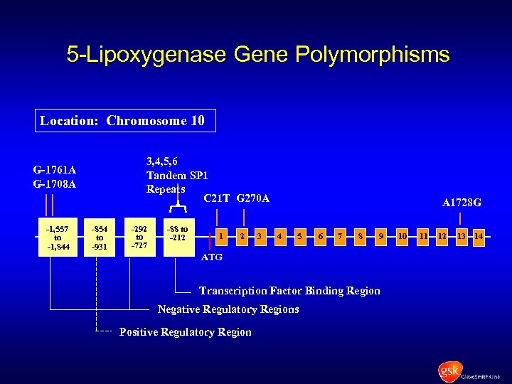 5 -Lipoxygenase Gene Polymorphisms Location: Chromosome 10 3, 4, 5, 6 Tandem SP 1 Repeats C 21 T G 270 A G-1761 A G-1708 A -1, 557 to -1, 844 -854 to -931 -88 to -292 to -212 -727 -88 to -212 1 2 3 A 1728 G 4 5 6 7 8 9 ATG Transcription Factor Binding Region Negative Regulatory Regions Positive Regulatory Region 10 11 12 13 14