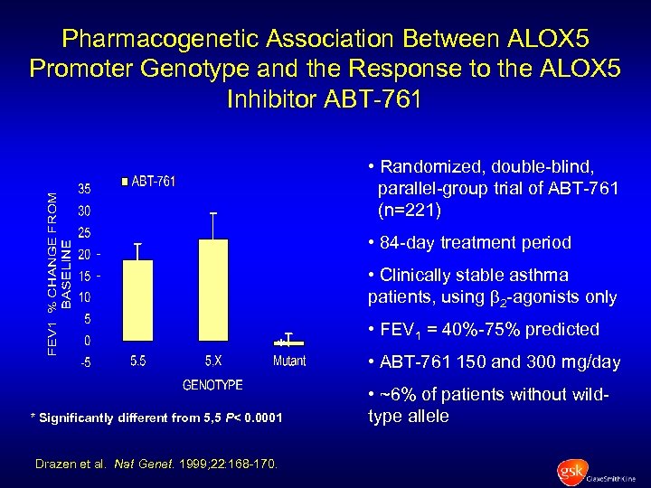 Pharmacogenetic Association Between ALOX 5 Promoter Genotype and the Response to the ALOX 5 Inhibitor ABT-761 • Randomized, double-blind, parallel-group trial of ABT-761 (n=221) • 84 -day treatment period • Clinically stable asthma patients, using 2 -agonists only * * Significantly different from 5, 5 P< 0. 0001 Drazen et al. Nat Genet. 1999; 22: 168 -170. • FEV 1 = 40%-75% predicted • ABT-761 150 and 300 mg/day • ~6% of patients without wildtype allele