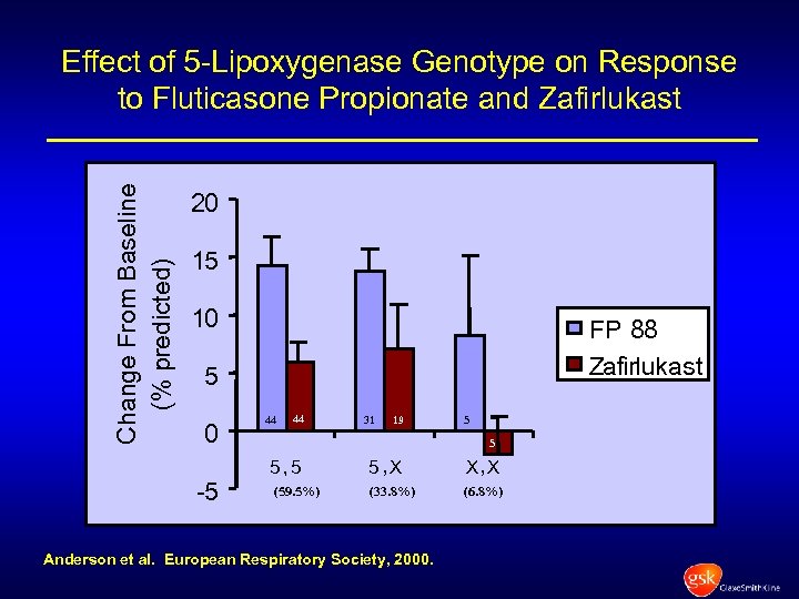 Change From Baseline (% predicted) Effect of 5 -Lipoxygenase Genotype on Response to Fluticasone Propionate and Zafirlukast 20 15 10 FP 88 Zafirlukast 5 0 -5 44 44 31 19 5 5 5, 5 (59. 5%) 5 , X X, X (33. 8%) (6. 8%) Anderson et al. European Respiratory Society, 2000.