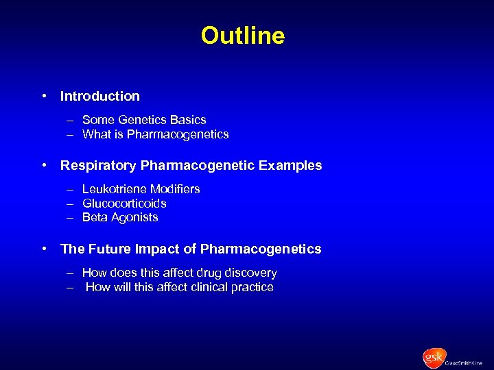 Outline • Introduction – Some Genetics Basics – What is Pharmacogenetics • Respiratory Pharmacogenetic Examples – Leukotriene Modifiers – Glucocorticoids – Beta Agonists • The Future Impact of Pharmacogenetics – How does this affect drug discovery – How will this affect clinical practice