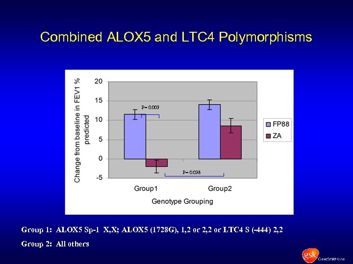 Combined ALOX 5 and LTC 4 Polymorphisms P= 0. 003 P= 0. 038 Group 1: ALOX 5 Sp-1 X, X; ALOX 5 (1728 G), 1, 2 or 2, 2 or LTC 4 S (-444) 2, 2 Group 2: All others