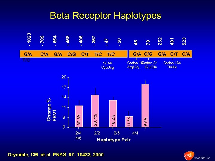 G/A T/C C/A G/A C/G C/T T/C G/A C/G T/C 19 AA Cys/Arg Codon 16 Codon 27 Arg/Gly Glu/Gln 20 - 14 - 2/6 Haplotype Pair Drysdale, CM et al PNAS 97; 10483, 2000 6. 6% 2/2 11. 6% 5 - 18. 2% 2/4 4/6 8 - 20. 7% 11 30. 6% Change % FEV 1 17 - 4/4 523 491 252 79 46 - 20 - 47 - 367 - 406 - 468 - 654 - 709 - 1023 Beta Receptor Haplotypes G/A C/T C/A Codon 164 Thr/Ile