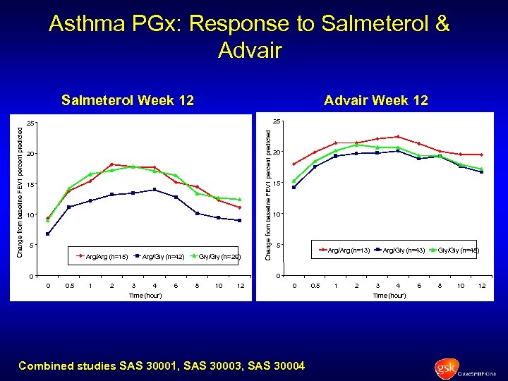 Asthma PGx: Response to Salmeterol & Advair Salmeterol Week 12 Advair Week 12 25 20 15 10 5 Arg/Arg (n=15) Arg/Gly (n=42) Gly/Gly (n=29) Change from baseline FEV 1 percent predicted 25 20 15 10 5 Arg/Arg (n=13) Arg/Gly (n=43) Gly/Gly (n=48) 0 0. 5 1 2 3 4 6 8 10 12 0 Time (hour) Combined studies SAS 30001, SAS 30003, SAS 30004 0. 5 1 2 3 4 Time (hour) 6 8 10 12