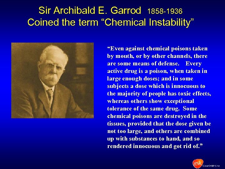 Sir Archibald E. Garrod 1858 -1936 Coined the term “Chemical Instability” “Even against chemical poisons taken by mouth, or by other channels, there are some means of defense. Every active drug is a poison, when taken in large enough doses; and in some subjects a dose which is innocuous to the majority of people has toxic effects, whereas others show exceptional tolerance of the same drug. Some chemical poisons are destroyed in the tissues, provided that the dose given be not too large, and others are combined up with substances to hand, and so rendered innocuous and got rid of. ”